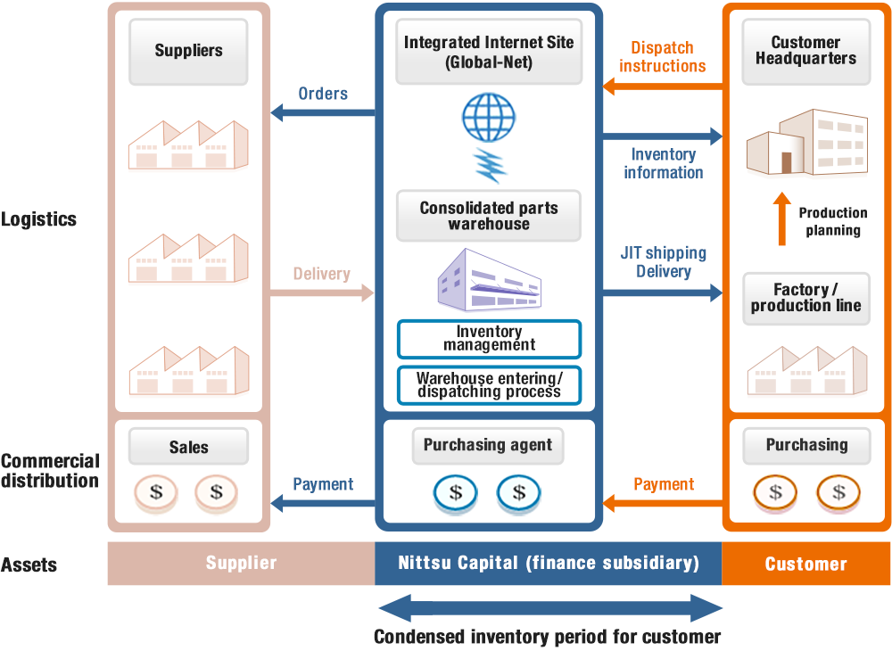 We have achieved streamlined procurement logistics and financing through the fusion of "Logistics Efficiency Service" and "Procurement Representative Function," in which the NX Group acts as a trading house, holding procured parts on behalf of the local factories.